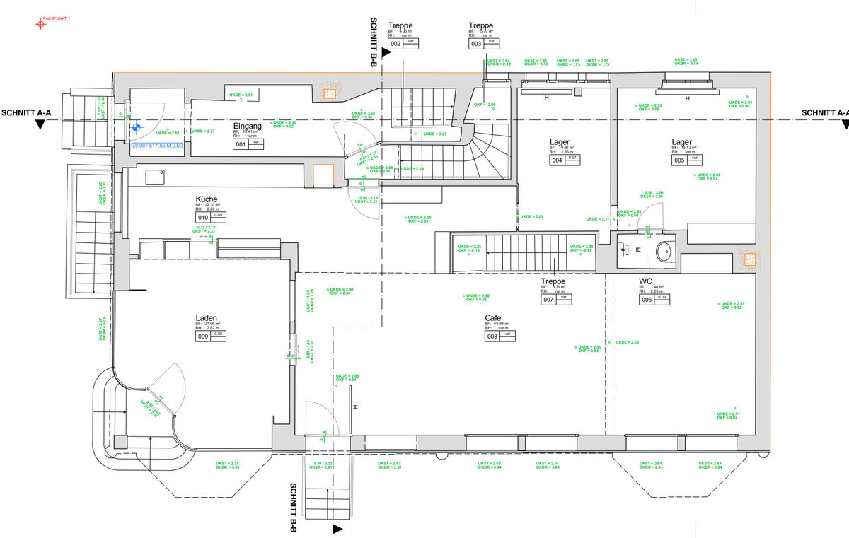Auf Wunsch können die Aufnahmen im Landeskoordinatensystem LV95LN02 oder nur in Bezug zu einem +/-0.00 Punkt abgegeben werden.